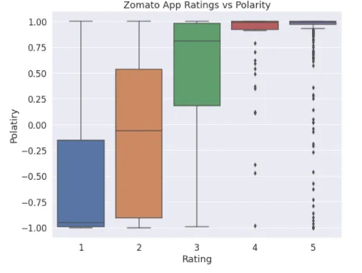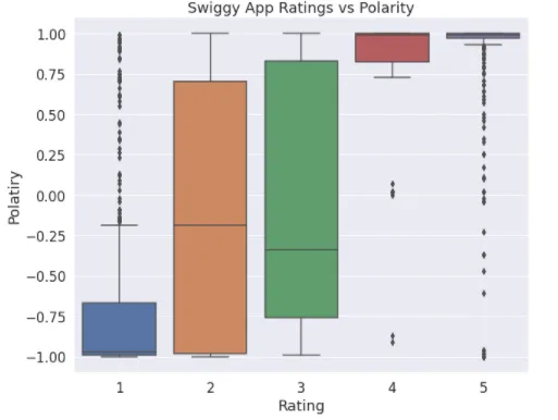 I wanted to check if the polarity goes with the rating. Mean polarity keeps going up with the higher rating in case of Zomato but the same is not true for Swiggy.